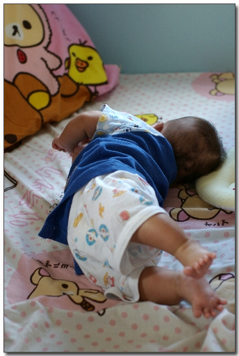 由昨晚開始發覺他並不滿足於此,翻身後不斷舞動手腳好像在想爬行,b朗當然沒有這麼快便懂得爬行,見自己花盡力氣後仍原地不動,便露出不快的表情及叫嚷。