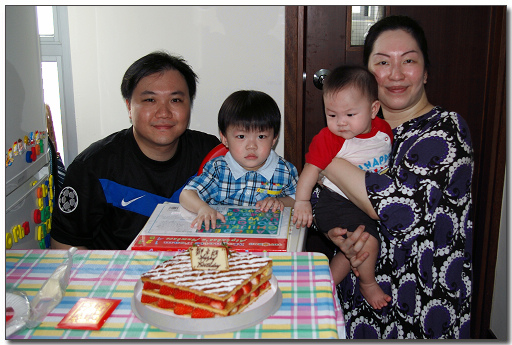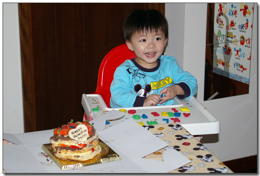 回家時姑媽和兩位表姐已準備好生日蛋糕,是agnès b. cafe的草莓拿破崙酥餅,b朗仍舊害怕燃點的蠟燭,而拍照後已急不及待玩著新買的拼字磁板;
