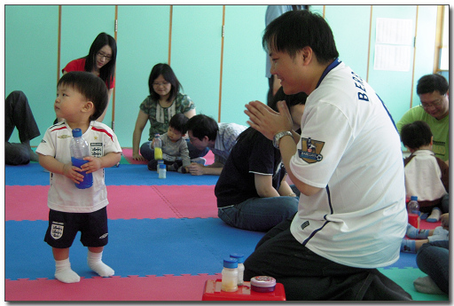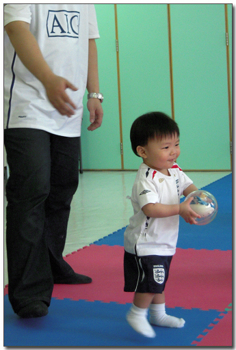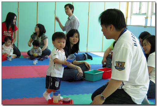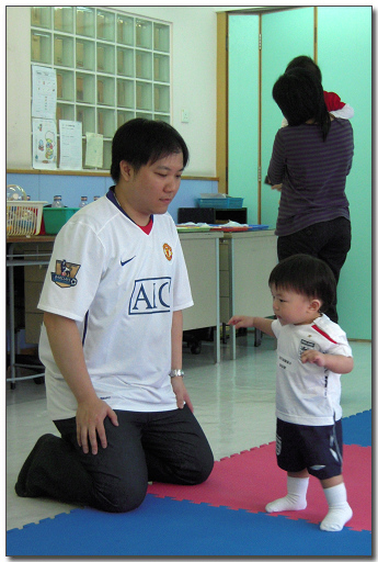 今早Playgroup上堂時,朗爸便讓b朗自己站著,嘗試自己步行;
