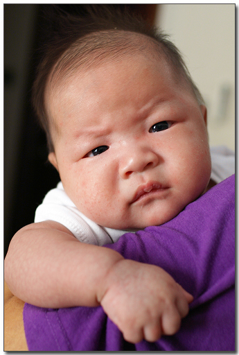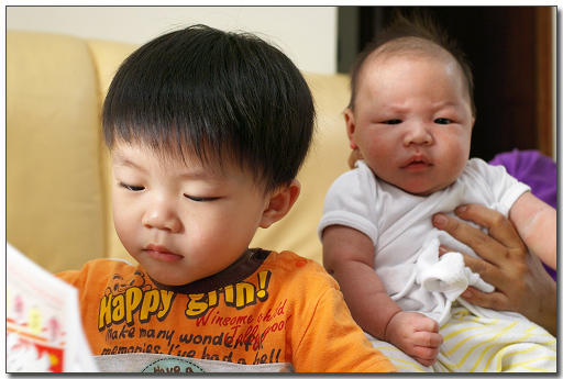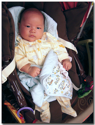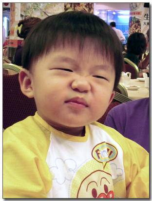 10月21日重陽長週末的第一天,白天待在家中無所事事,就為細b和b朗拍寫真照;現在細b較喜歡我們打直抱起他~皺起雙眉的樣子很趣怪~不合作的哥哥只顧看書......晚上繼細b雙滿月時大小朗兩兄弟齊出動,這回更要乘車出外,到佐敦的金山海鮮酒家,與外婆、舅父母,姨媽丈和表兄姊們吃飯;細b很乖,吃飽奶後就安靜地趟在嬰兒車內;b朗就不乖了,吃得半飽後便要落地四處走,亦沒有與表兄姊們一同玩耍。