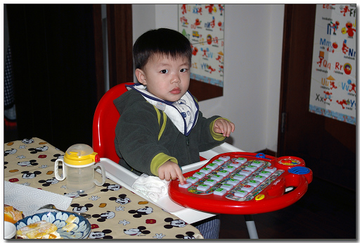 b朗現時最大的嗜好是觀看從電腦上播放關於英文字母的歌曲短片,常會拉住朗媽到電腦檯前並嚷著播放給他看;對二十六個大小英文字母背得滾瓜爛熟,只是部份發音不大準,所以我們開始教他拼字,他亦已懂得幾個;數字方面一至十二很早已認得,當中以"八"(eight)和"十"(ten)的發音較準;