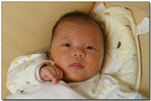 b朗開始懂得看著人,由其是抱著他時大多會凝望著你;至於瞼上的紅疹仍未完全消退;